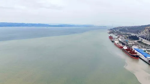 Kocaeli Körfez'de sağanak sonrası Hereke'den gelen çamurlu su İzmit Körfezi'nin bir bölümünü kahverengiye boyadı; görüntüler havadan ve cep telefonuyla kaydedildi.