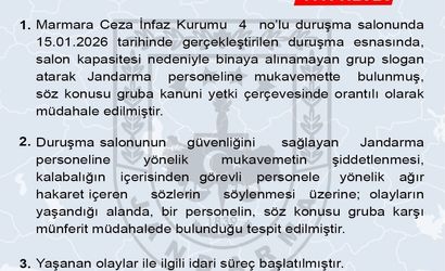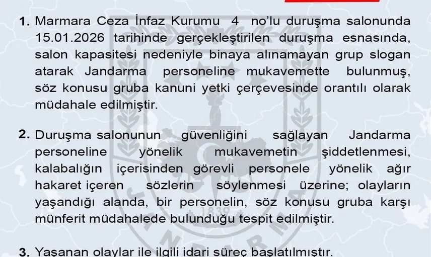 Jandarma Genel Komutanlığı, 15 Ocak Perşembe günü Marmara Ceza İnfaz Kurumu 4 no’lu duruşma salonunda yaşanan olaya ilişkin sosyal medya hesabından açıklama yayımladı. Açıklamada, duruşma sırasında salon kapasitesi nedeniyle binaya alınamayan grubun slogan attığı ve Jandarma personeline mukavemette bulunduğu bildirildi.