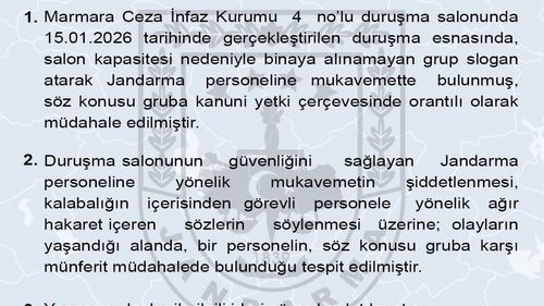 Jandarma, 15 Ocak'ta Marmara Ceza İnfaz Kurumu duruşmasında salon kapasitesi nedeniyle dışarıda kalan grubun personele mukavemette bulunması üzerine kanuni yetkiyle orantılı müdahale yapıldığını duyurdu.