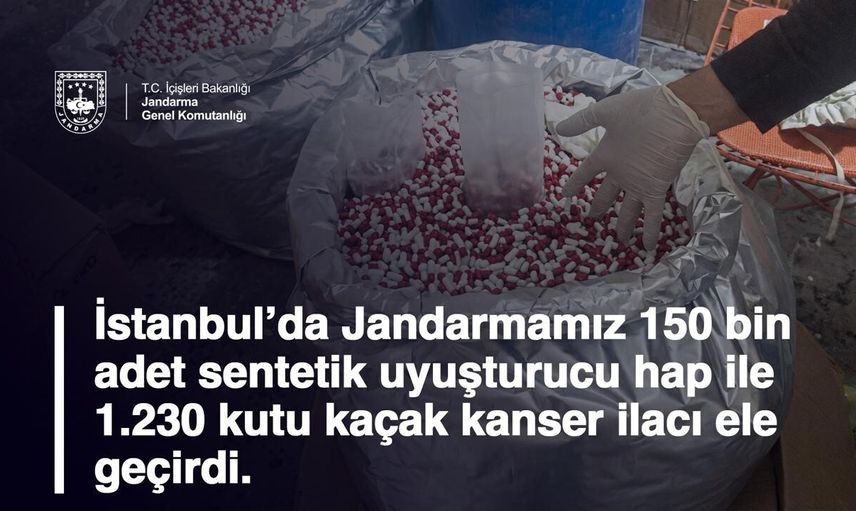 JANDARMA GENEL KOMUTANLIĞI EKİPLERİNİN İSTANBUL CUMHURİYET BAŞSAVCILIĞI İLE KOORDİNELİ DÜZENLEDİĞİ OPERASYONDA 150 BİN ADET SENTETİK UYUŞTURUCU HAP İLE BİN 230 KUTU KAÇAK KANSER İLACI ELE GEÇİRİLİRKEN 6 ŞÜPHELİ YAKALANDI.