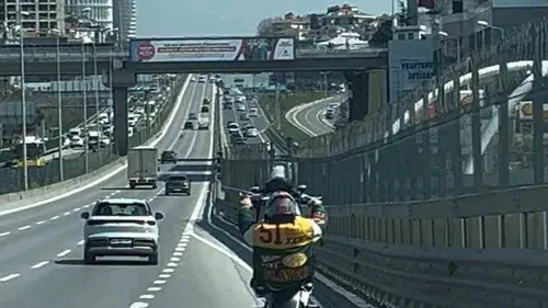 Kadıköy D-100 Karayolu Acıbadem mevkiinde bir motosiklet sürücüsünün plakasız motosikletle tek teker üzerinde yaptığı tehlikeli sürüş cep telefonu kamerasına yansıdı.