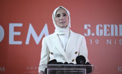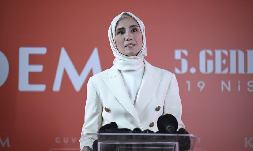 KADEM Mütevelli Heyet Başkanı Sümeyye Erdoğan Bayraktar, Cumhurbaşkanı Recep Tayyip Erdoğan'ın katılımıyla Atatürk Kültür Merkezi'nde düzenlenen KADEM 5. Genel Kurulu'na katılarak konuşma yaptı.