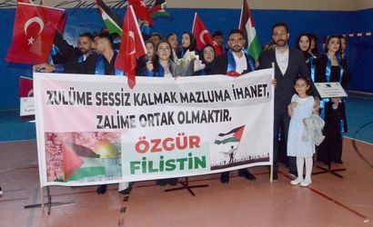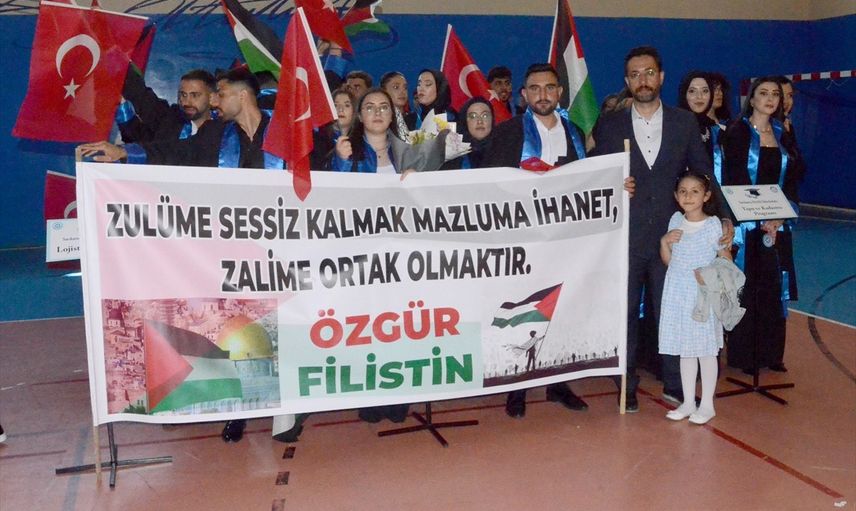 Kafkas Üniversitesinin mezuniyet törenine öğrenciler, Türkiye ve Filistin bayrakları ile "Zulme sessiz kalmak mazluma ihanet, zalime ortak olmaktır" pankartıyla katıldı.