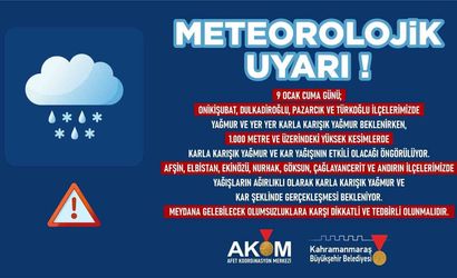 Kahramanmaraş Büyükşehir Belediyesi Afet Koordinasyon Merkezi (AKOM), 9 Ocak Cuma günü şehir genelinde etkili olması beklenen yağmur ve kar yağışına karşı vatandaşları uyardı.