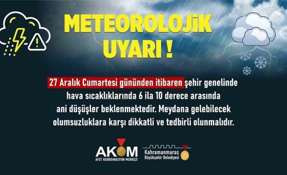 KAHRAMANMARAŞ BÜYÜKŞEHİR BELEDİYESİ AFET KOORDİNASYON MERKEZİ, 27 ARALIK CUMARTESİ GÜNÜNDEN İTİBAREN ŞEHİR GENELİNDE HAVA SICAKLIKLARINDA 6 İLA 10 DERECE ARASINDA ANİ DÜŞÜŞLER YAŞANACAĞINI BELİRTEREK DİKKATİ VE TEDBİRLİ OLUNMASI NOKTASINDA VATANDAŞLARI UYARDI.