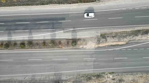 Kahramanmaraş Dulkadiroğlu Çiğli mevkiinde 6 Şubat 2023 depremleri sonrası yol yaklaşık 7 metre kaydı; sürücüler durumun tehlikeli olduğunu dron görüntüleriyle aktarıyor.