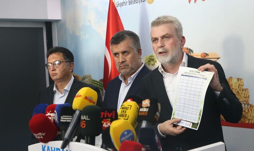 Kahramanmaraş Büyükşehir Belediye Başkanı Fırat Görgel (kürsüde), 6 Şubat 2023'teki Kahramanmaraş merkezli depremler ve kuraklık nedeniyle kent genelindeki 63 mahallede uygulanan zamanlı içme suyu iletimi ile ilgili açıklamalarda bulundu.