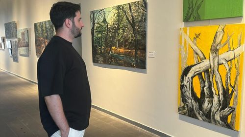 Karma resim sergisi 'Kaotik Kentin Gölgesinde Manzara', AKM Galeri'de sanatseverlerle buluştu. Sergide, kent yaşamı ve doğa temaları işleniyor.