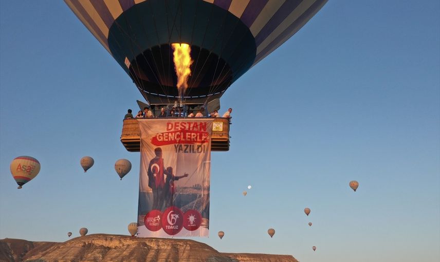 Nevşehir'deki turizm merkezi Kapadokya'da,15 Temmuz Demokrasi ve Milli Birlik Günü dolayısıyla sıcak hava balonları Türk bayrakları ve afişlerle uçtu. AK Parti Nevşehir Gençlik Kolları tarafından bazı balonlara üzerinde "Destan gençlerle yazıldı" yazılı poster asıldı.