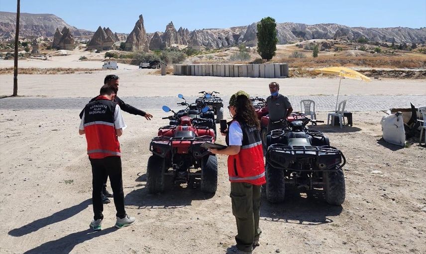 Kapadokya Alan Başkanlığı, kaçak faaliyet yürüten veya bölgenin doğal dokusuna zarar veren ATV tur hizmeti sunan firmaları denetledi. Saha çalışmaları kapsamında ATV istasyonlarında bulunan araçların ve firmaların izinli ATV sayıları kontrol edilerek izinsiz faaliyet gösteren firma ve araçlar tespit edildi.