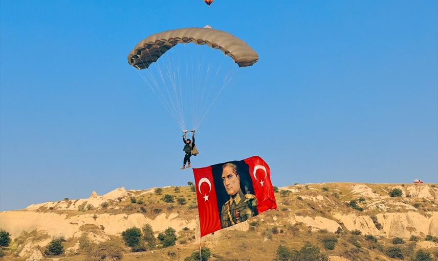 Nevşehir'de, Jandarma Teşkilatı'nın 186. kuruluş yıl dönümü dolayısıyla Jandarma Komando Özel Asayiş Komutanlığı (JÖAK) timi, sıcak hava balonundan paraşütle atlayış gerçekleştirdi.