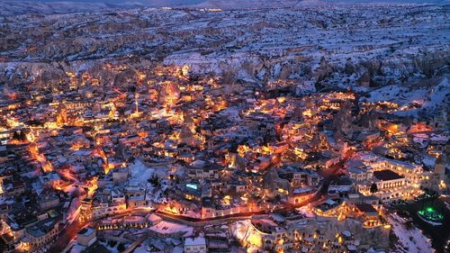 Kapadokya, karla kaplandığında şehir ışıklarıyla masalsı görüntüler sunarak ziyaretçileri etkiliyor.