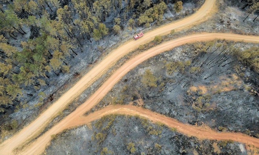 Karabük'ün Eflani ilçesinde çıkan ve büyük ölçüde kontrol altına alınan yangında zarar gören alanlar dronla görüntülendi.