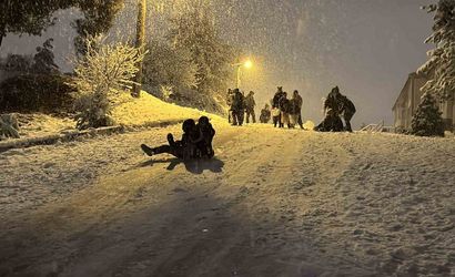 Öte yandan kar yağışını fırsata çeviren çocuklar, poşet ve kızaklarla yokuşlardan kayarak karın tadını çıkardı. Şehir merkezindeki park ve sokaklarda eğlenen çocukların neşeli anları renkli görüntüler oluşturdu.