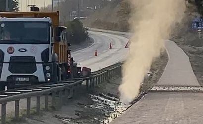 KARABÜK'TE KARAYOLLARI EKİPLERİNİN YÜRÜTTÜĞÜ ÇALIŞMA SIRASINDA PATLAYAN DOĞAL GAZ BORUSU TEDİRGİN ETTİ.