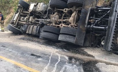 Karabük'ün Safranbolu ilçesinde gerçekleşen kaza, 37 SC 082 plakalı zift yüklü bir kamyonun devrilmesi ile yaşandı.