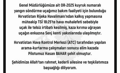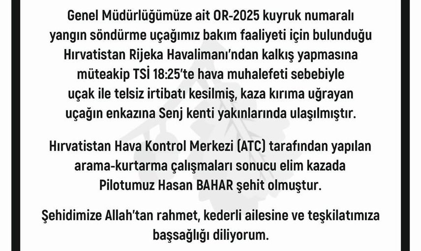 Açıklamada, Genel Müdürlüğe ait OR-2025 kuyruk numaralı yangın söndürme uçağının bakım faaliyeti için bulunduğu Hırvatistan Rijeka Havalimanı'ndan kalkış yaptığı, kalkışın ardından saat 18.25'te hava muhalefeti nedeniyle uçak ile telsiz irtibatının kesildiği bildirildi.
