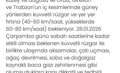Yetkililer, kuvvetli rüzgârla birlikte ulaşımda aksamalar, çatı uçması, ağaç devrilmesi ile soba ve doğalgaz kaynaklı baca gazı zehirlenmeleri risklerine karşı vatandaşların dikkatli ve tedbirli olmalarını istedi.