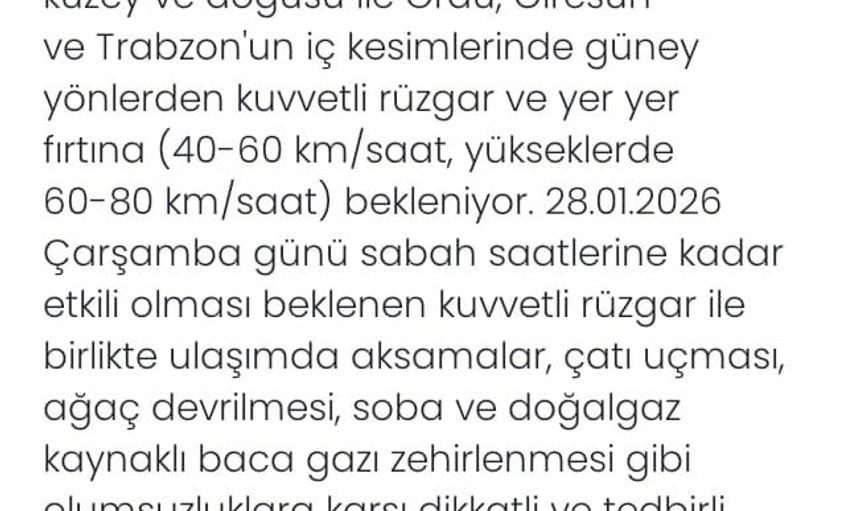 Açıklamaya göre Samsun çevreleri ile Sinop ve Kastamonu’nun kuzeyi, Tokat’ın kuzey ve doğu kesimleri ile Ordu, Giresun ve Trabzon’un iç bölgeleri akşam saatlerinden itibaren güney yönlerden kuvvetli rüzgâr ve yer yer fırtına bekliyor.