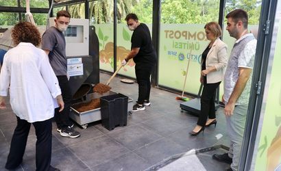 Trabzon'da Karadeniz Teknik Üniversitesi (KTÜ) kampüsündeki üç yemekhaneden toplanan atıklar, geri dönüşüm projeleri kapsamında kompost ünitesinde organik gübreye dönüştürülüyor. Ürünler kompost ünitesinden gübre olarak çıkıyor.