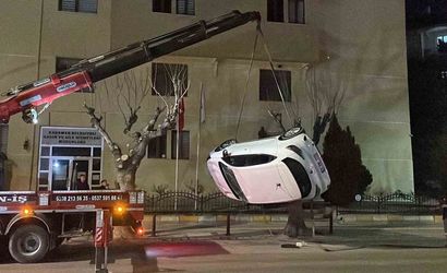Karaman’da park halindeki araçlara çarpan otomobil devrildi