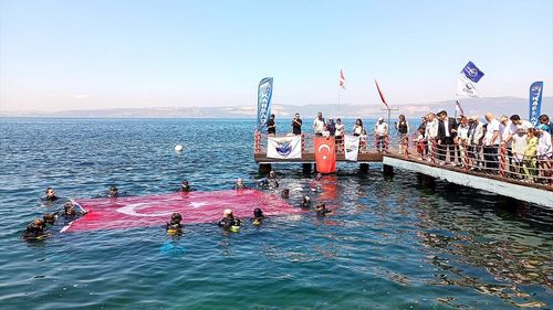 Karamürsel Su Altı Sporları Derneği'nden 24 dalgıç, İzmit Körfezi'nde dalış yapıp su yüzeyinde Türk bayrağı ve Atatürk posteri açarak 30 Ağustos'u kutladı.