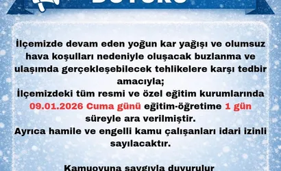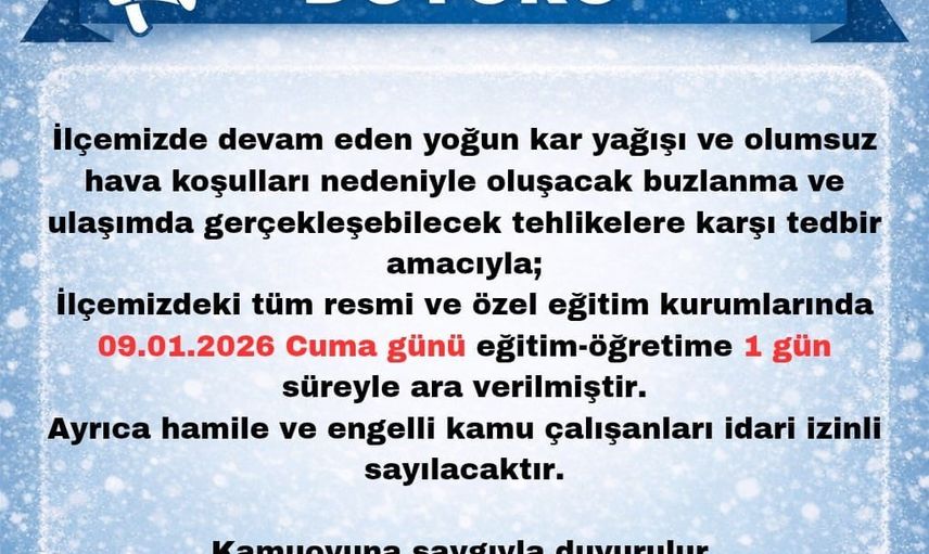 İlçemizde devam eden yoğun kar yağışı ve olumsuz hava koşulları nedeniyle oluşacak buzlanma ve ulaşımda gerçekleşebilecek tehlikelere karşı tedbir amacıyla; ilçemizdeki tüm resmi ve özel eğitim kurumlarında 9 Ocak 2026 Cuma günü eğitim-öğretime 1 gün süreyle ara verilmiştir.