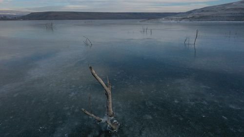 Kars'ta hava sıcaklığının sıfırın altında 15 dereceye kadar düştüğü dondurucu soğuklar, Kars Barajı'nın yüzeyini de dondurdu.