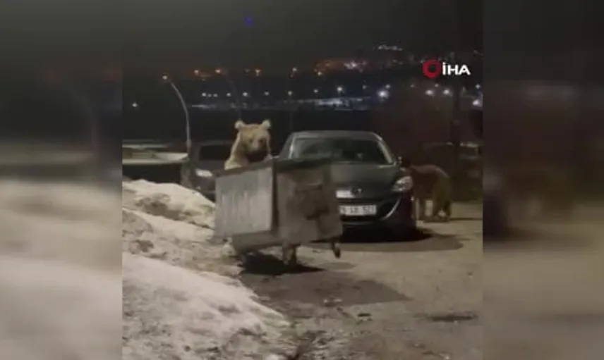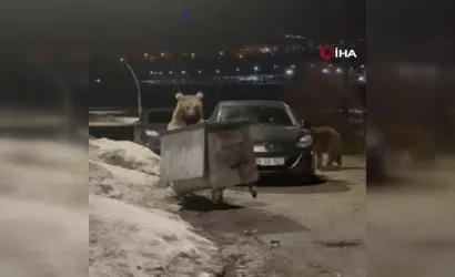 Kars'ın Sarıkamış ilçesi sınırlarında, gece saatlerinde yerleşim alanına inen iki bozayı oteller bölgesindeki bir çöp konteynerini devirerek etrafa saçılan atıkları karıştırdı. Hayvanlar bir süre bölgede kalarak yerdeki atıkları didikledi.