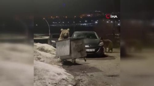 Kars'ın Sarıkamış ilçesinde yerleşime inen iki bozayı, oteller bölgesindeki çöp konteynerini devirdi ve atıkları karıştırdı; cep telefonu kamerasına yansıdı.