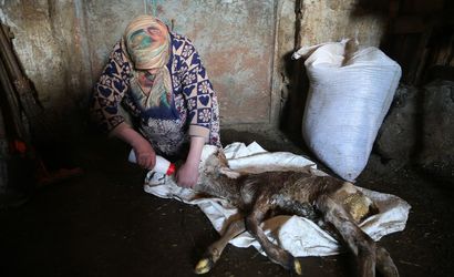 Kars'ın Susuz ilçesinde bir besicinin doğum yapan ineğinin ikiz buzağılarından birinin baş kısmının büyük ve öne doğru eğik olması, görenleri şaşırttı.