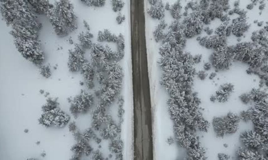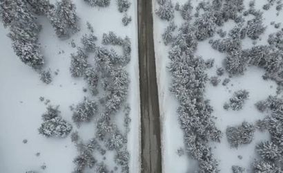 Dron ile kaydedilen görüntüler, yolun çevresindeki koyu yeşil sarıçamlarla bembeyaz kar dokusu arasındaki kontrastı net biçimde yansıtıyor. Bu görseller, bölgenin hem sadeliğini hem de ihtişamını aynı karede sunuyor; izleyenlerde sessiz ve soğuk bir atmosfer hissi bırakıyor.