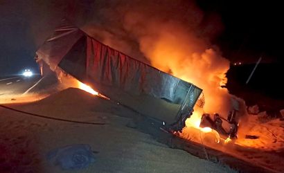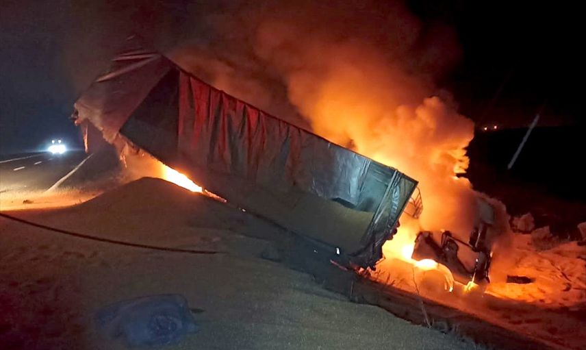 Hafif ticari araca çarpan ve mısır tanesi yüklü olan tır, Deniz Kızılaslan (26) tarafından yönetiliyordu. Tır, Serkan Güler (38) sürücülüğündeki 35 BME 547 plakalı hafif ticari araçla çarpıştıktan sonra şarampole devrildi ve alev aldı.