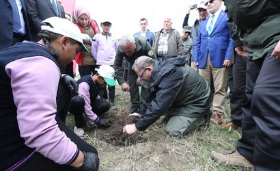 Kars Valisi Ziya Polat'ın (sağda) "Her ilçeye örnek meyve bahçesi" talimatı doğrultusunda Selim ilçesinde oluşturulan bahçede fidanlar toprakla buluşturuldu. Vali Polat'ın da katılımıyla düzenlenen törenle 400 meyve ağacı toprakla buluşturuldu. Kurulması planlanan örnek meyve bahçelerine kayısı, ceviz, armut ve badem gibi 4 bin meyve ağacı dikilecek.