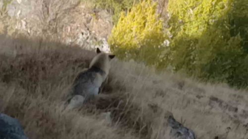 Kars Kalesi çevresinde yiyecek arayan kızıl tilki, bir vatandaşın cep telefonu kamerasınca görüntülendi; hayvan bir süre sonra bölgeden uzaklaştı.