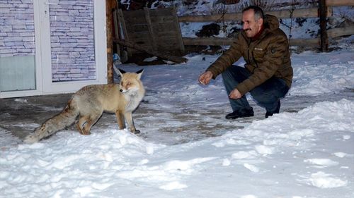 Kars'ın Sarıkamış ilçesindeki Tepe Mahallesi sakinleri, 'Kar güzeli' adını verdikleri kızıl tilkiyi her gün besliyor.