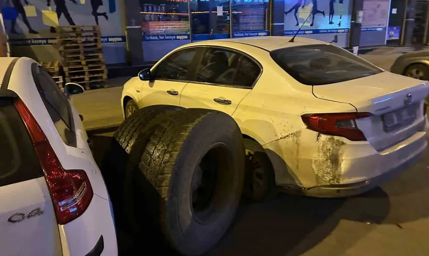Kopan teker, cadde kenarında park halinde bulunan araçlara çarparak maddi hasara yol açtı. Çarpmanın etkisiyle bazı araçların kaporta ve cam kısımlarında ciddi hasar oluştu.