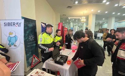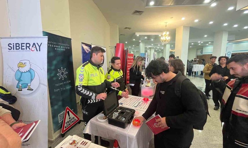 Trafik Denetleme Şube Müdürlüğü tarafından Kafkas Üniversitesi Ahmet Arslan Kongre ve Kültür Merkezi'nde düzenlenen bilgilendirme etkinliğinde, öğrencilere trafik güvenliği bilincini artırmaya yönelik uygulamalı tanıtımlar yapıldı.