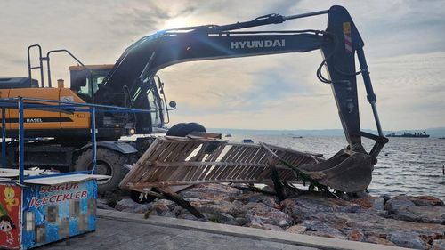 Karşıyaka sahilinde Kıyı ve İmar Kanunu’na aykırı inşa edilen izinsiz platform ve ahşap iskelelerin İzmir Büyükşehir ekiplerince yıkımına başlandı.