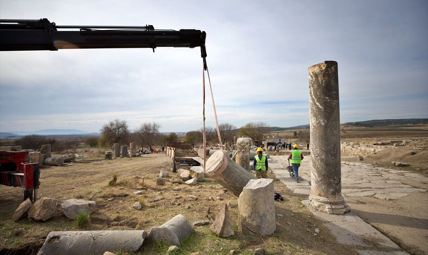 Bu kapsamda, antik kentte devrilen sütunlar, uygun şekilde restore edilerek eski görünümlerine kavuşturuluyor. Ayrıca, parke taşlı yolun toprak altında kalan bölümleri de yapılan kazı çalışmalarında gün yüzüne çıkarılmakta.
