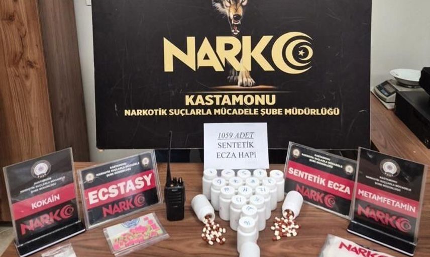 Ele geçirilen materyaller arasında; 1.059 adet sentetik ecza, 147,09 gram metamfetamin, 7,25 gram kokain, 73 adet ecstasy hap, 244 adet kilitli şeffaf poşet ve 1 adet el telsizi bulundu.