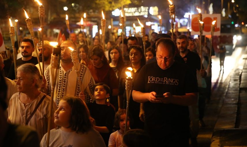 Program için katılımcılar Kışla Parkı'nda toplandı. Protokol üyeleri ve vatandaşlar, ellerinde fenerler ve Türk bayrakları ile Cumhuriyet Meydanı'na kadar yürüdü. Meydanda topluluğun tamamlanmasının ardından saygı duruşu yapıldı ve İstiklal Marşı okundu.