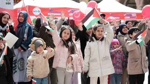 Kastamonu'da çocuklar, 'Minik Kalplerden Filistin İçin Umut Balonları' kapsamında yazdıkları mektupları ve resimleri balonlara bağlayıp Nasrullah Meydanı'ndan gökyüzüne bıraktı.