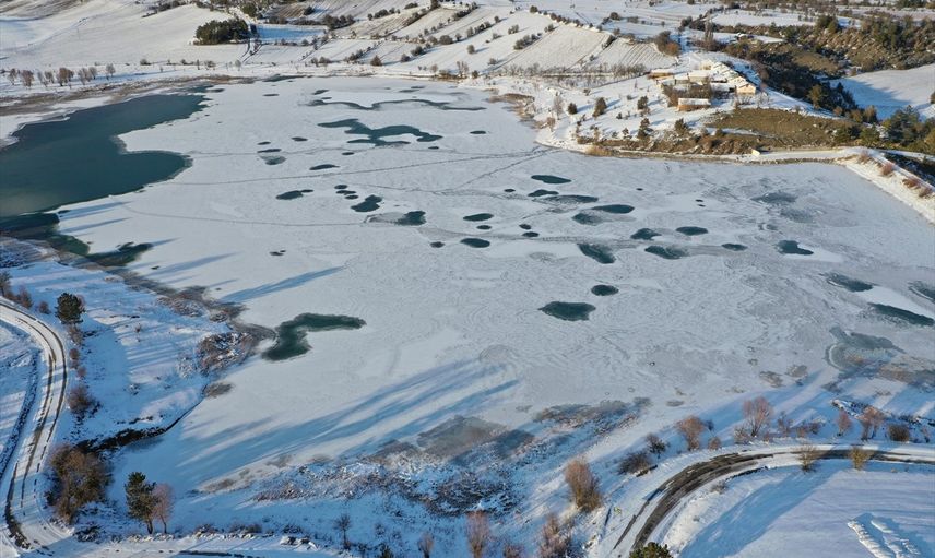 Kastamonu'nun Daday ilçesinde büyük bölümü buz tutan Yumurtacı Göleti dron ile görüntülendi.