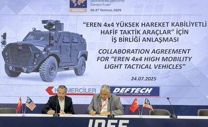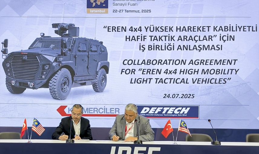 Anadolu Ajansının (AA) "Global İletişim Ortağı" olduğu 17. Uluslararası Savunma Sanayii Fuarı (IDEF 2025), Milli Savunma Bakanlığının ev sahipliğinde, Cumhurbaşkanlığı Savunma Sanayii Başkanlığının desteğiyle, Türk Silahlı Kuvvetlerini Güçlendirme Vakfının (TSKGV) yönetim ve sorumluluğunda ve KFA Fuarcılık AŞ'nin organizatörlüğünde İstanbul Fuar Merkezi'nde (İFM) devam ediyor. Katmerciler ile Malezyalı savunma sanayisi şirketi DEFTECH arasında "EREN 4X4 Yüksek Hareket Kabiliyetli Hafif Taktik Araçlar" için işbirliği anlaşması imzalandı. İmza törenine Katmerciler Üst Yöneticisi (CEO) Mehmet Katmerci (sağda) ve DEFTECH CEO'su Mohammad Shanaz bin Mohammad Shees (solda) katıldı.