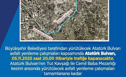 Büyükşehir Belediyesi tarafından yürütülecek Atatürk Bulvarı asfalt yenileme çalışmaları kapsamında Atatürk Bulvarı, 05.11.2025 saat 20.00 itibariyle trafiğe kapanacaktır. Atatürk Bulvarı’nın Tut Kavşağı ile Cemil Baba Mezarlığı kesimi arasında yürütülecek asfalt yenileme çalışmaları tamamlanana kadar sürücülerimizin belirtilen tarih ve saatten itibaren trafik işaret ve işaretçilerini dikkate alarak alternatif güzergâhları kullanmaları ve vatandaşlarımızın otobüs seferleri için belirlenen alternatif otobüs güzergâhlarını dikkate almaları önemle rica olunur