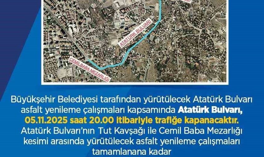 Atatürk Bulvarı, 05.11.2025 saat 20.00 itibarıyla trafiğe kapanacaktır. Çalışma, Atatürk Bulvarı’nın Tut Kavşağı ile Cemil Baba Mezarlığı kesimi arasında yürütülecektir.