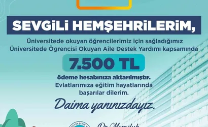 "Yerel yönetim hizmetlerimizle çocuklarımız ve gençlerimizin daha donanımlı bir şekilde yetişmelerine katkı sunmaya çalışırken, yükseköğrenim gören ihtiyaç sahibi öğrencilerimize ve ailelerine maddi olarak destek sağlıyoruz. Üniversitede Öğrencisi Okuyan Aile Destek Yardımı projemizde bu eğitim öğretim yılı için destek ödemeleri ailelerin hesaplarına aktarıldı. 2.697 aileye 20 milyon 227 bin 500 TL destek ödemesi yaptık. Aileler, öğrencilerimiz için güle güle harcasınlar"