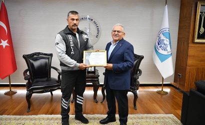 Kayseri'de karşı perona geçmeye çalışan kadın yolcuya tramvayın çarpmasını önleyen güvenlik görevlisi Ayhan Akkış (solda), Kayseri Büyükşehir Belediye Başkanı Memduh Büyükkılıç tarafından (sağda) "Teşekkür Belgesi" ile ödüllendirildi.