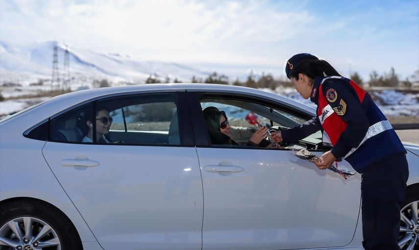 Kayseri'de kadın jandarmalar, kontrol noktasında durdurdukları araçlardaki hemcinslerine karanfil takdim etti.